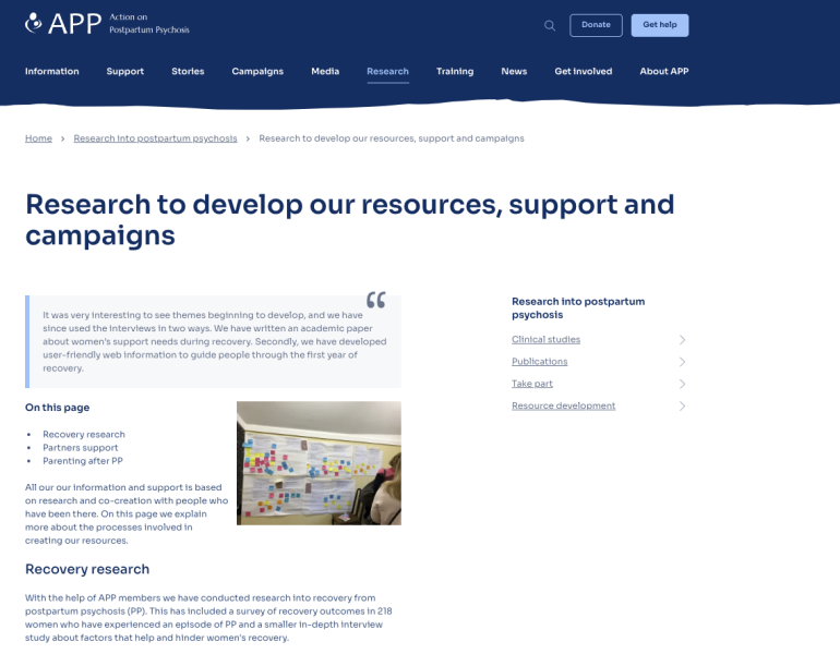 Over 2022 I have been project-managing (and doing the majority of the work on) a new website for Action on Postpartum Psychosis (APP). APP is a small charity, struggling after Covid and with the cost of living crisis. They could not afford an expensive agency to work on their new design, structure and content. A friendly, patient and generous designer created a new homepage and second-level content template (thanks Chris) and I was able to do the remainder of the first iteration of updates for them. Hopefully further design work and updates will follow when their financial situation improves (donate here).